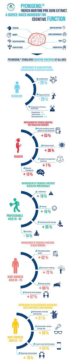 As a consequence, people are looking at natural, safe and efficacious product solutions. Research has shown Pycnogenol® French maritime pine bark extract improves cognitive function. Studies reveal Pycnogenol® improve both numerical and spatial working memory using a computerized testing system.
