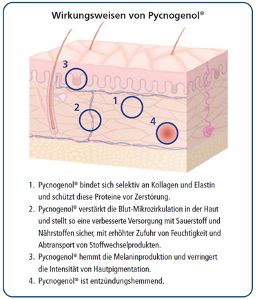 2. Pycnogenol® verbessert die Blut-Mikrozirkulation in der Haut und stellt so eine verbesserte Versorgung mit Sauerstoff und Nährstoffen mit erhöhter Zufuhr von Feuchtigkeit und Abtransport von Stoffwechselprodukten sicher.