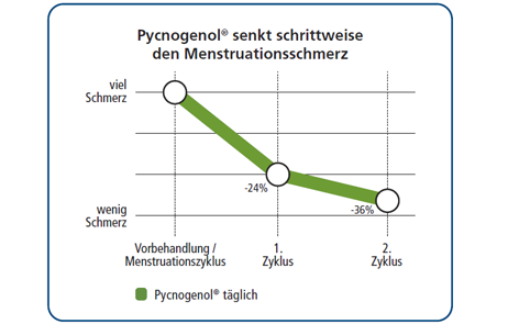 Eine Forschungsarbeit, die im European Bulletin of Drug Research veröffentlicht wurde, kommt zu dem Schluss, dass Pycnogenol® bei Frauen mit Menstruationsbeschwerden die abdominalen Beschwerden um 80% und die Krämpfe um 77% verringert. Dr. Nobutaka Suzuki führte eine multizentrische Feldstudie zu Pycnogenol® bei Menstruationsbeschwerden durch. Die Ergebnisse zeigten, dass die Behandlung mit Pycnogenol® die Schmerzhaftigkeit während der Menstruation verringerte, was sich in einer deutlichen Reduzierung der benötigten Medikamente zeigte. Pycnogenol® linderte die Beschwerden bereits nach einem Monat und verschaffte nach dem zweiten Monat weitere Linderung.