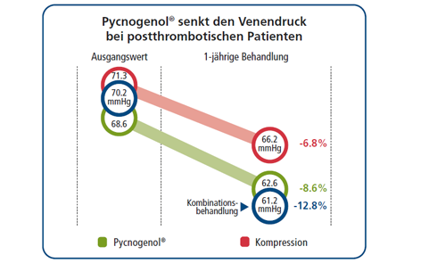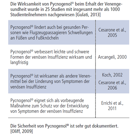 In einigen Fällen können allgemeine Schwellungen der Beine sich zu einer gefährlichen chronisch-venösen Insuffizienz (CVI) entwickeln, die, wenn sie nicht behandelt wird, zu Komplikationen und Ulzerationen (Geschwürbildungen) führen kann. Bisher wurden 15 klinische Studien mit insgesamt 784 Patienten zu venöser Insuffizienz und Pycnogenol® veröffentlicht. Die hohe Wirksamkeit von Pycnogenol® als Therapie der venösen Insuffizienz war in der Tat in zahlreichen Studien so deutlich, dass es regelmäßig zusammen mit bekannten Arzneimitteln für gesunde Venen untersucht wird. Dies wird in einer deutschen Doppelblind-Vergleichsstudie mit 40 CVI-Patienten deutlich. Es wurde gezeigt, dass Pycnogenol® in einer geringeren Dosierung Ödeme der unteren Extremitäten wirksamer verringerte und die Symptome der CVI wirksamer linderte als Rosskastaniensamenextrakt. Darüber hinaus untersuchte eine klinische Studie mit 70 Patienten die Wirkung von Pycnogenol® bei der Behandlung der venösen Insuffizienz im Vergleich zu Troxerutin, einem wasserlöslichen Derivat von Rutin, einer üblichen Behandlung für die CVI. Nach einer Behandlung über 60 Tage erzielte eine Kombination aus Troxerutin und Pycnogenol® signifikantere Ergebnisse bei der Linderung der Symptome der CVI als Troxerutin alleine.