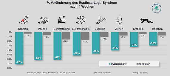 In einer neuen Parallelgruppen-Studie aus dem Jahr 2022 konnte jetzt gezeigt werden, dass der natürliche Pflanzenextrakt aus der französischen Meereskiefer, Pycnogenol®, als Ergänzung zur Standardbehandlung zahlreiche Symptome des RLS signifikant lindern konnte. Insgesamt wurde 45 Studienteilnehmer:innen mit RLS eingeschlossen (ansonsten waren sie gesund), 24 in der Standardmanagement-Gruppe und 21 in der Pycnogenol®-Gruppe. Das Standardmanagement beinhaltete moderate Bewegungsübungen, Supplementation mit Vitamin C und B-Vitaminen sowie eine vorgeschriebene Diät mit wenig Koffein, NaCl und scharfem Essen. Die Pycnogenol®-Gruppe erhielt zusätzlich täglich 150/mg Pycnogenol® über 4 Wochen.