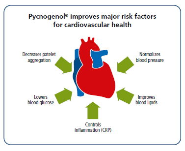 Pycnogenol® extracto de corteza de pino marítimo francés puede contribuir significativamente a mejorar algunos de los factores de riesgo, con la estabilización de la tensión sanguínea y la función plaquetaria, la mejora de los lípidos en la sangre además de los valores de azúcar en la sangre. Un número importante de estudios clínicos demuestran la eficacia de Pycnogenol® a la hora de mantener los problemas cardiovasculares alejados. Se estudió Pycnogenol® en personas saludables, en personas en el límite de factores de alto riesgo ytambién en personas tomando prescripción médica por cuestiones relacionadas con problemas cardiovasculares.