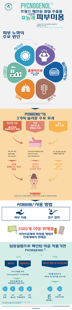 피크노제놀®은 피부 단백질인 콜라겐과 엘라스틴을 결합시켜 다양한 유해 효소로부터 피부를 보호하며 매끈하고 젊은 피부에 필수적인 피부의 탄력을 회복하는 데 도움을 줍니다.